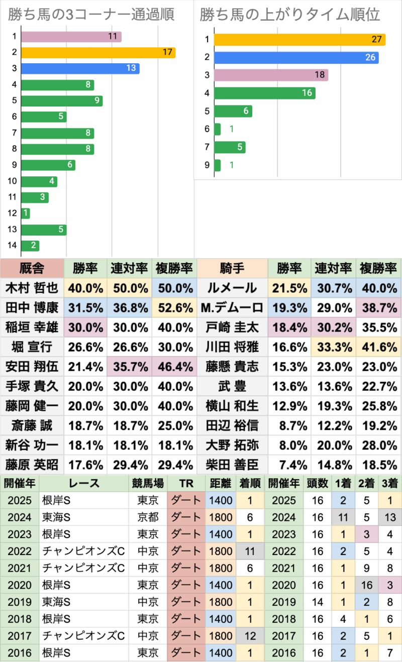 | 臨戦過程 | 重賞からの臨戦が11連勝中 G1昇格後の29年間で、前走が重賞でない馬が勝ったのは1回だけ 直近11年間の内訳は、根岸Sが5頭、チャンピオンズC/東海Sが3頭ずつ 前走がチャンピオンズCだった馬はすべて、前走着外に負けている 前走が根岸S/東海Sだった8頭の内、前走1着でないのは2024年の1頭だけ チャンピオンズC以外で着外だった勝ち馬は、2000年以来24年ぶりだった |