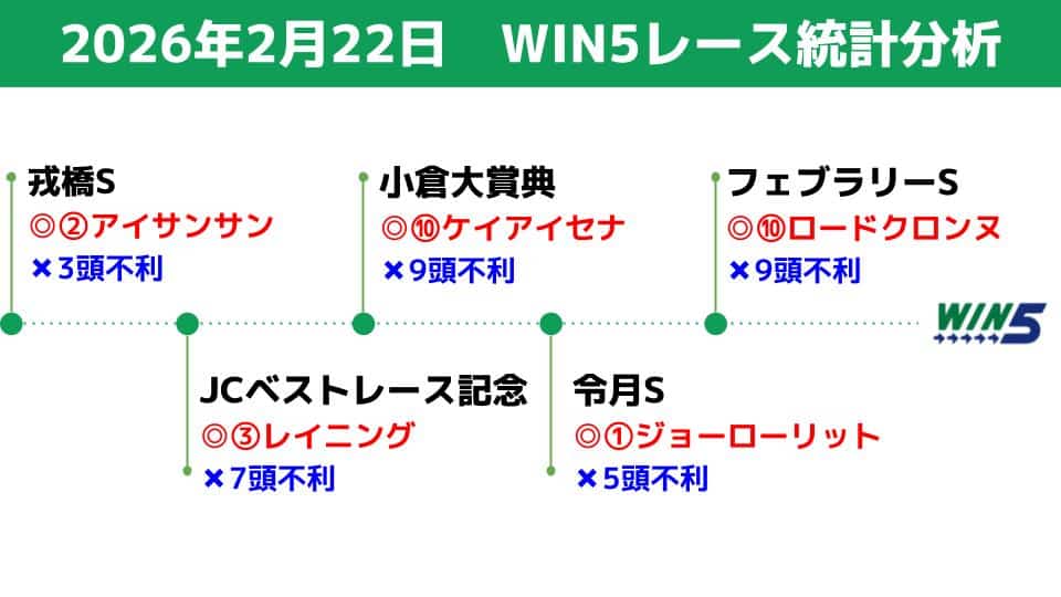 2/22(日)のWIN5対象レースの統計データを分析し、買える馬/消せる馬を検討します
