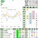 | 臨戦過程 | 2019〜2023年にかけて東京1800-2000mからの臨戦が5連勝していたが、 直近2年は新潟2200m/中山2200mから臨戦の勝ち馬が発生 2024年に発生した距離短縮の勝ち馬が17年ぶりだったが、傾向が変化している |