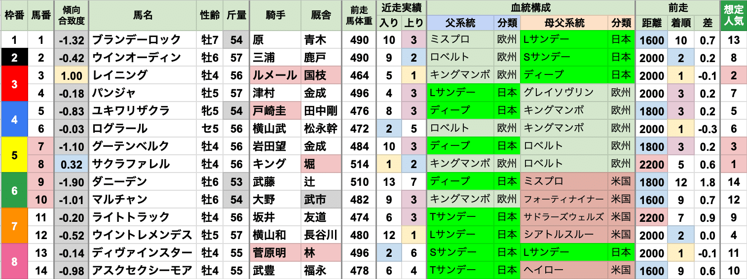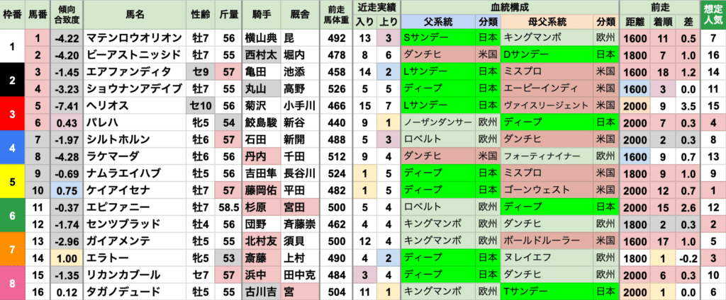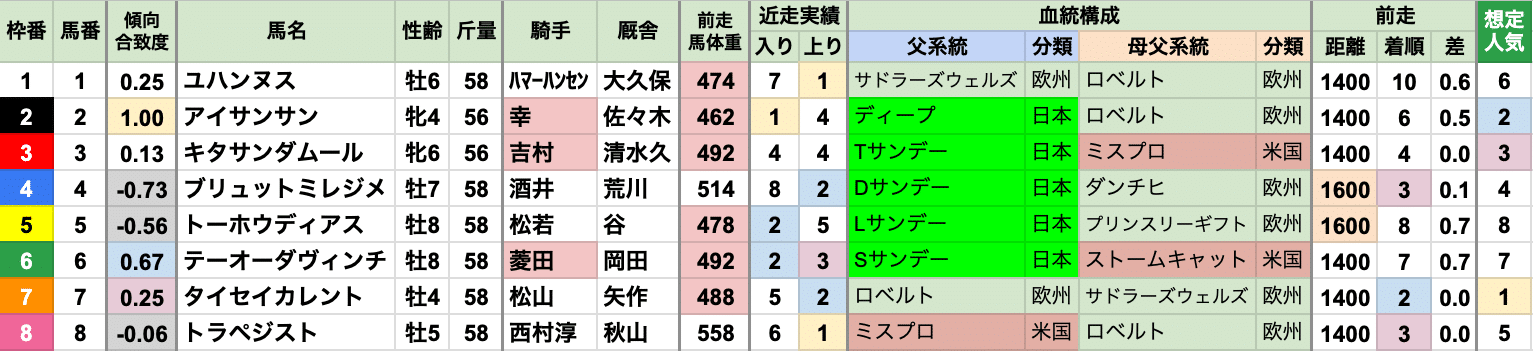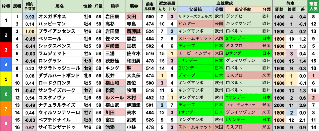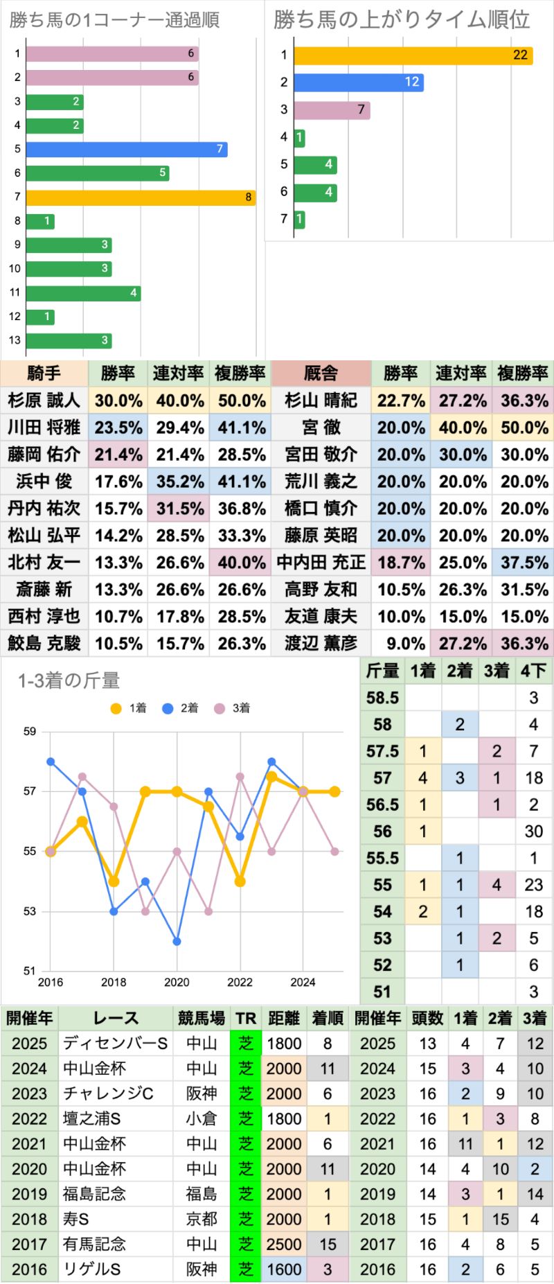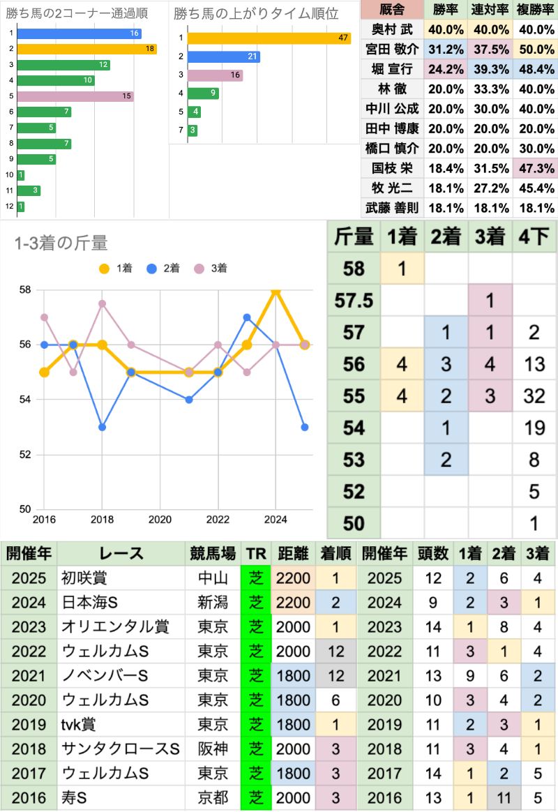 | 斤量 | 設定斤量51-58.5kg、勝ち馬斤量54-57.5kg 56.5〜57kgの勝率が高く、57kg以上が3連勝中 それ以上に出走頭数の多い55kg/56kgは、それぞれ1勝ずつに留まる 軽ハンデは不利な傾向で、定量が増えた2023年以降は、54kg以下が[0-0-0-4] |
