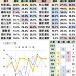 | 奥村武の勝率が飛び抜けて高い 宮田敬介も勝率30%を超えて、この二人がかなり高い水準 全体の勝率に比べると、中川公成/牧光二/武藤善則は、この条件で特に高い |