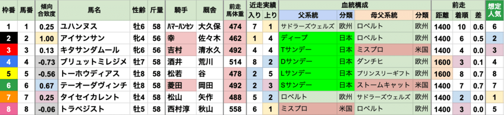 | 臨戦過程 | 勝ち馬の前走レースは重複なし 前走1400m以上が9頭で、距離延長は苦戦傾向 |