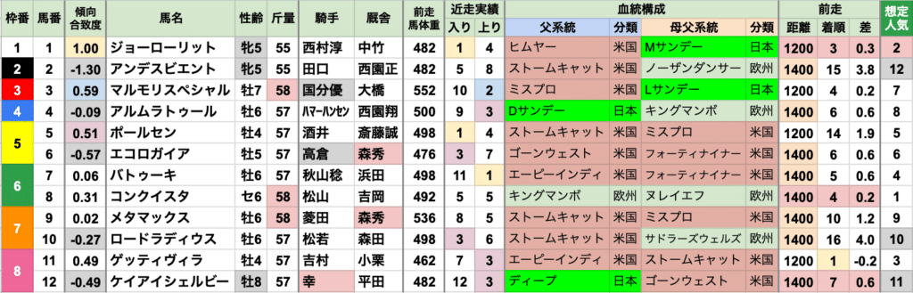 | 人気 | 直近5年で2番人気が4勝している 1200mになって以降、1番人気が未勝利 8番人気/9番人気の1着があり、やや大きく荒れやすい |