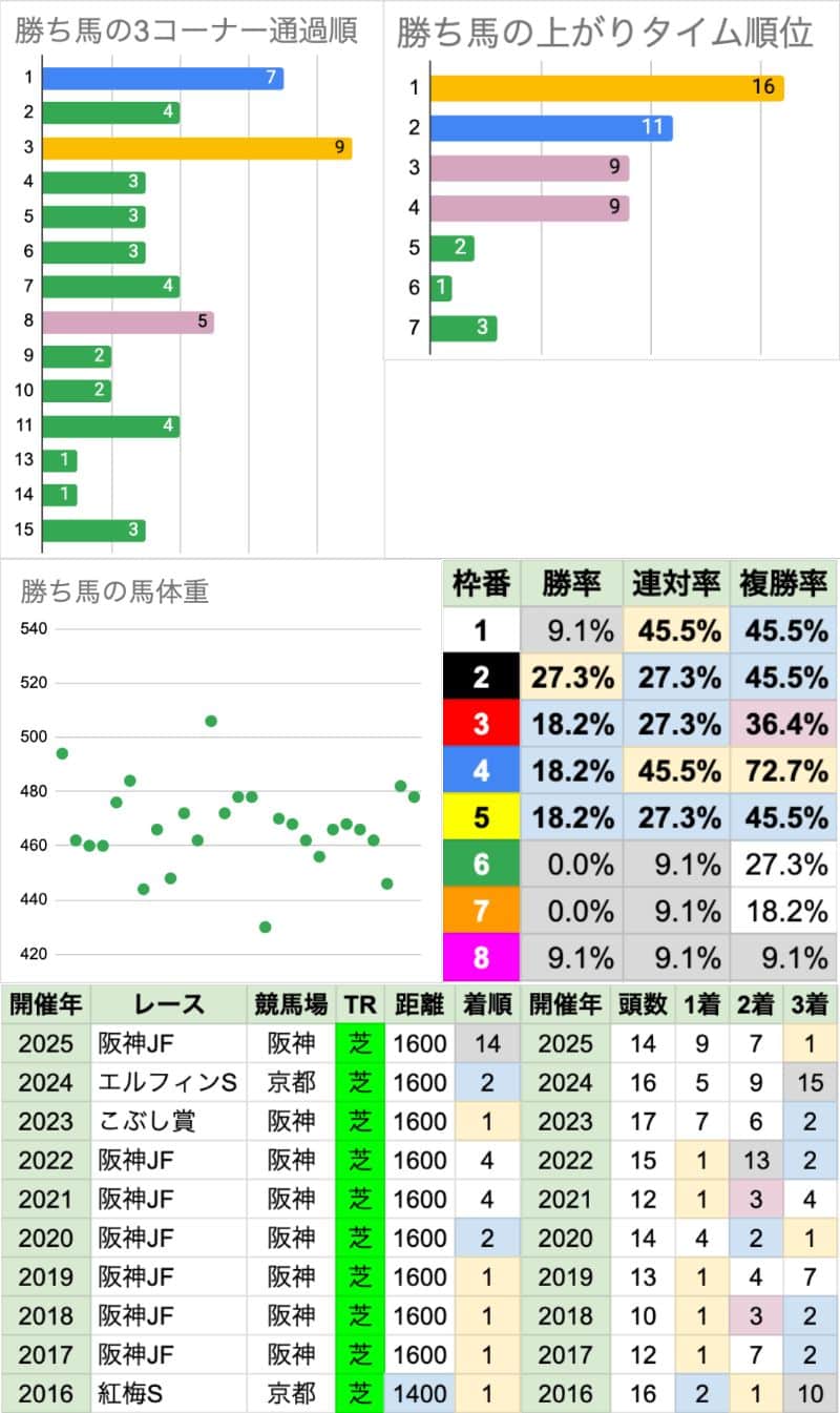 | 臨戦過程 | 2017〜2022年にかけて阪神JFからの臨戦が6連勝していたが、 近年は桜花賞直行が増え、多様化している 昨年は3年ぶりに阪神JFからの勝ち馬が出ているが、 前走5着以下の勝ち馬は2008年以来17年ぶりで、これもレアケースだった 前走が阪神/京都1400-1600mでない勝ち馬は、2010年以降で1頭だけ 重賞昇格以降の31年間で、前走から距離短縮した勝ち馬は2006年の1頭だけ |