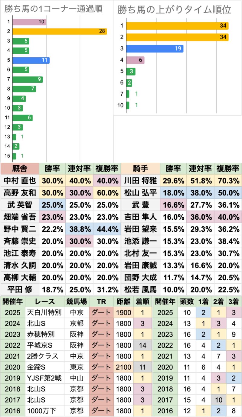 | 臨戦過程 | 2019年以降、昇級初戦と、現級2戦目以降が、交互に勝っている 現級2戦目以降の5頭は、その内3頭が北山Sからの臨戦 レースの重複はこの北山Sのみだが、その内2頭が2018年以前で、近年は分散傾向 前走がローカルだったのは2頭で、いずれも中京から |