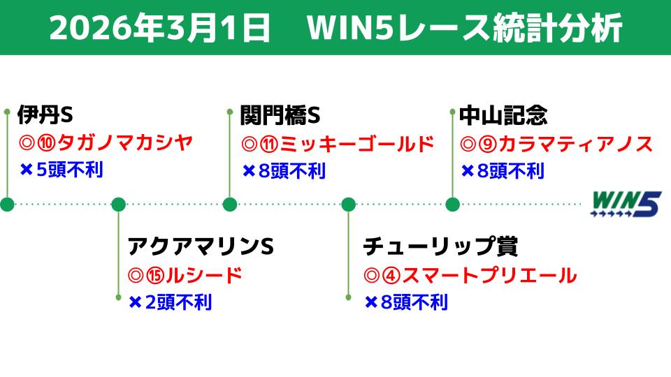 3/1(日)のWIN5対象レースの統計データを分析し、買える馬/消せる馬を検討します