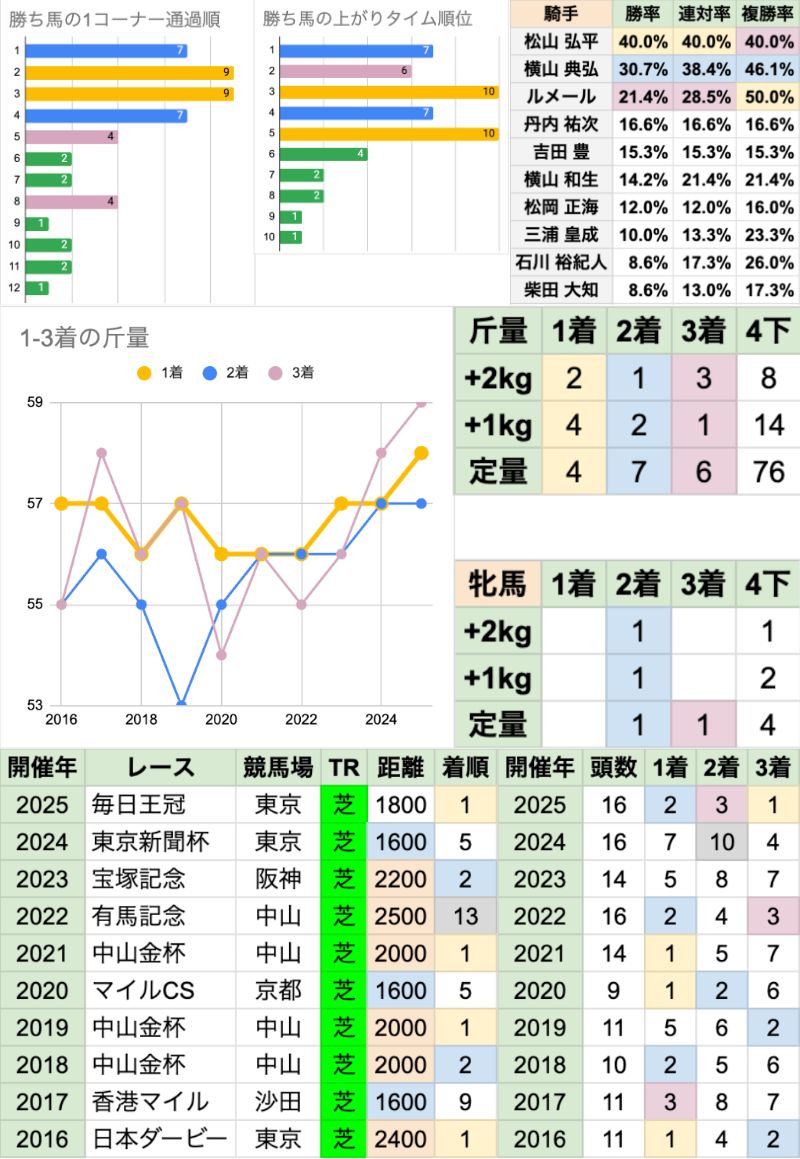 | 斤量 | 設定斤量53−59kg、勝ち馬斤量56−58kg 加算斤量別の着度数は以下の通り +2kg[2-1-3-8] +1kg[4-2-1-14] 定量 [4-7-6-76] 斤量加算馬の勝率が高いが、2021〜2024年にかけて定量馬が4連勝 特に+2kgは2017年以降[0-0-3-8]で、上位人気に支持されても苦戦傾向 牝馬は直近10年間未勝利だが、[0-3-1-7]で好走傾向 |