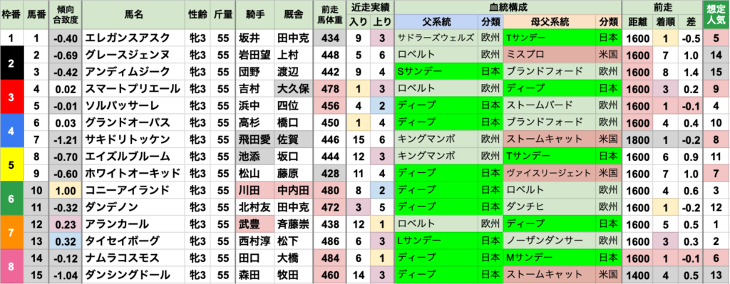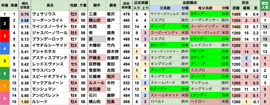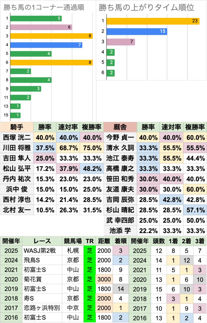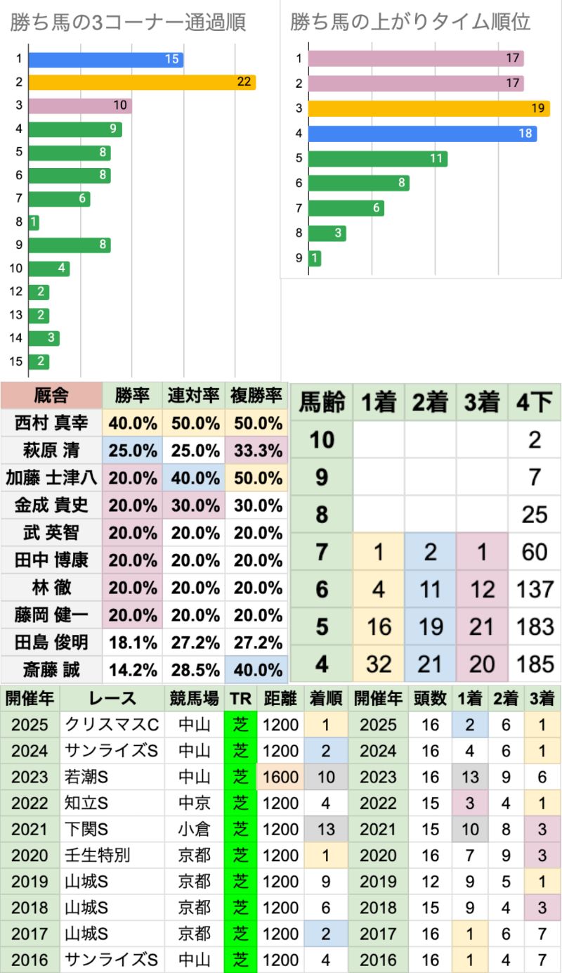 | 臨戦過程 | このレースが1200mになった2010年から継続して、 サンライズS/山城Sを中心に、中山/京都1200mからの臨戦が有利な傾向 2023年以降は、1回京都に該当の番組が組まれていないことから、 中山からの臨戦が3連勝中 過去16回で昇級初戦は2勝だけで、現級経験馬の壁が厚いが、 その2回が2020年/2025年に発生していて、頻度が上がってきている |