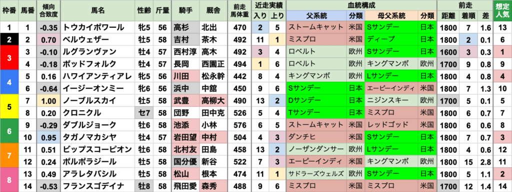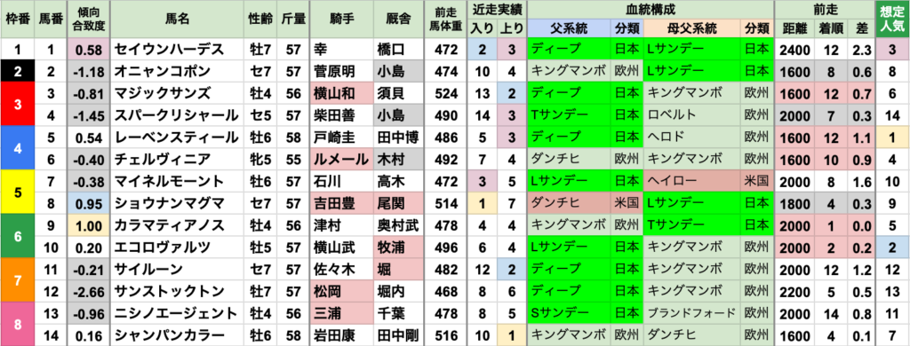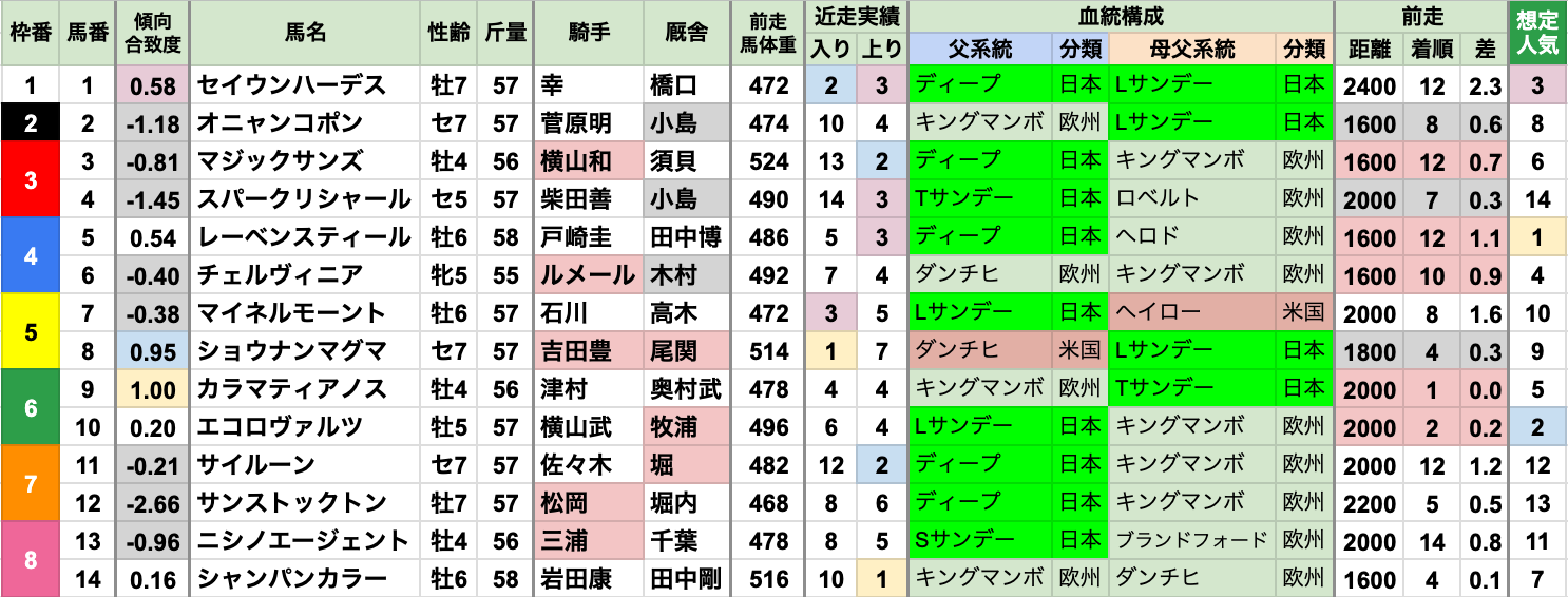 | 人気 | 1番人気が4勝している一方で、隔年で6→5→8番人気が勝っている 12頭付近になりやすいが、二桁人気も2頭連対していて、大荒れしやすい |
