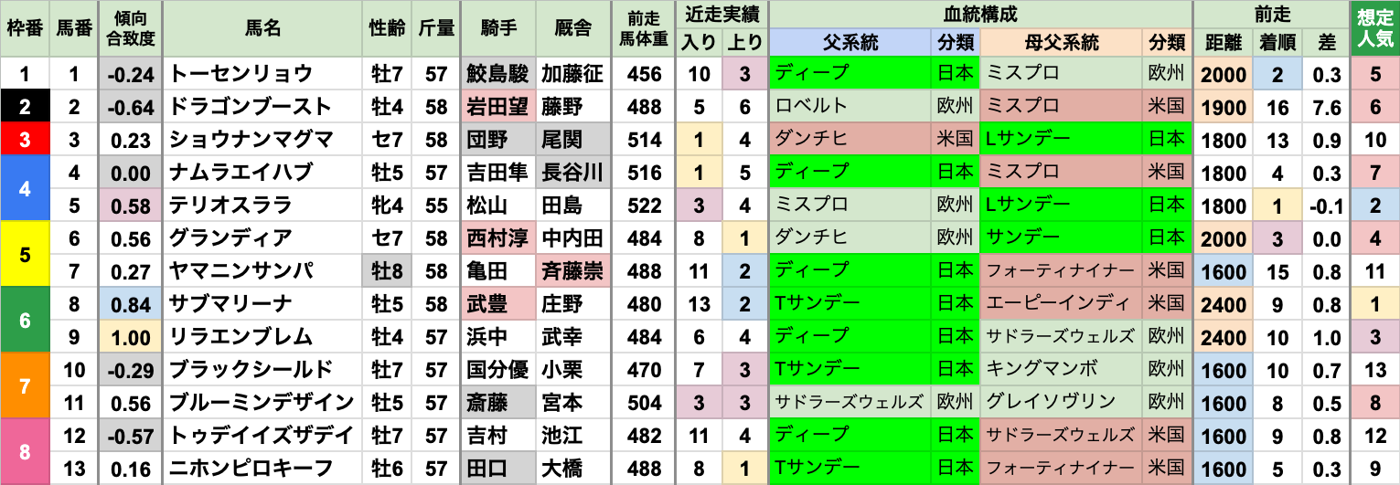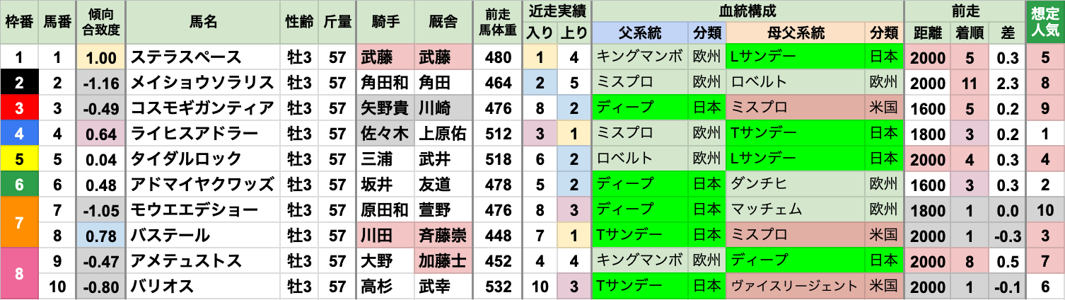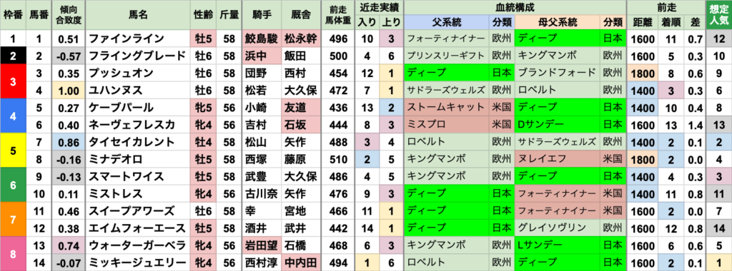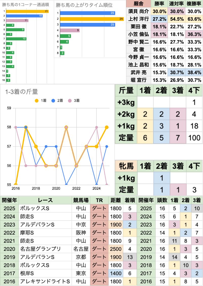 | 斤量 | 設定斤量55-59kg、勝ち馬斤量55-58kg 加算斤量別の着度数は以下の通り +3kg[0-0-0-1] +2kg[2-2-2-4] +1kg[2-3-1-18] 定量 [6-5-7-100] 斤量加算馬の勝率が高い傾向 2022〜2024年にかけては定量馬が3連勝していたが、 昨年また斤量加算馬が勝っている |