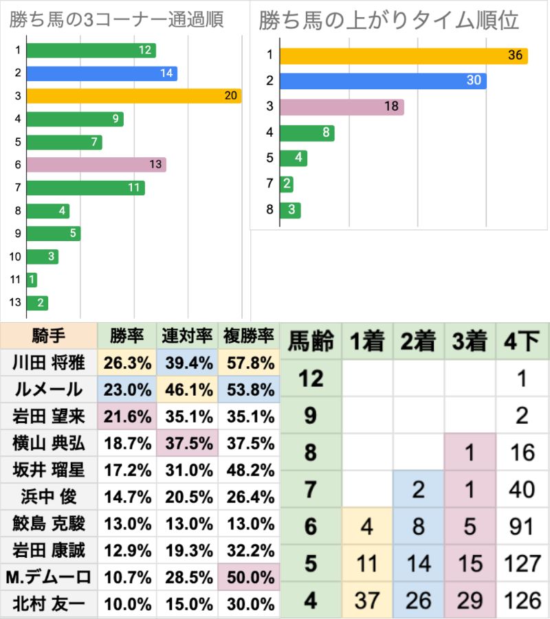 | 人気 | 4番人気以下が5勝、二桁人気も2勝していて、荒れやすい 前走着順と勝ち馬人気が相関しやすい 特に昇級初戦は[2-2-0-16]で、1番人気になった馬に限ると[2-2-0-2] |