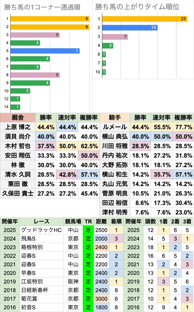 | 臨戦過程 | 前走も中山2000mを走った馬が直近6年で5勝 内訳は1勝クラスが3頭、ホープフルSが2頭 過去10年全体で、前走がオープンクラスでない勝ち馬は、この3頭のみ 2024年の勝ち馬は前走1勝クラスで2着だが、 重賞以外で2着以下だった勝ち馬は、27年ぶりのレアケース 中山2000mを連戦であれば、どのようなパターンでも有利傾向が強い 距離延長はすべて重賞からで、2010年以降、前走1600mの場合はすべて朝日杯FS |