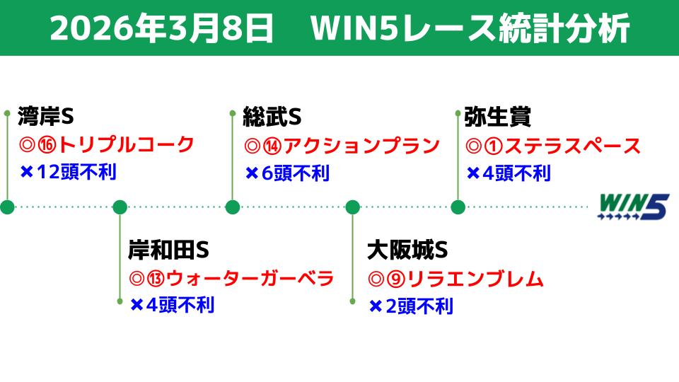 3/8(日)のWIN5対象レースの統計データを分析し、買える馬/消せる馬を検討します