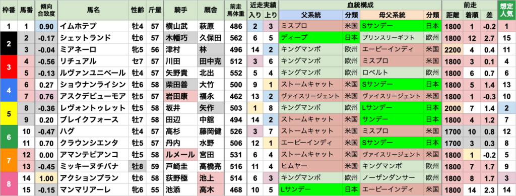 | 臨戦過程 | 2019〜2023年にかけて、前走から距離短縮した馬が5連勝していたが、 直近は1600mからの距離延長が2連勝中 前走は重賞4頭、オープン特別/リステッド4頭、3勝クラス2頭と、路線は様々 距離違いも含めた過去42年間で、前走オープンクラスで1着だった馬の連勝は無い |